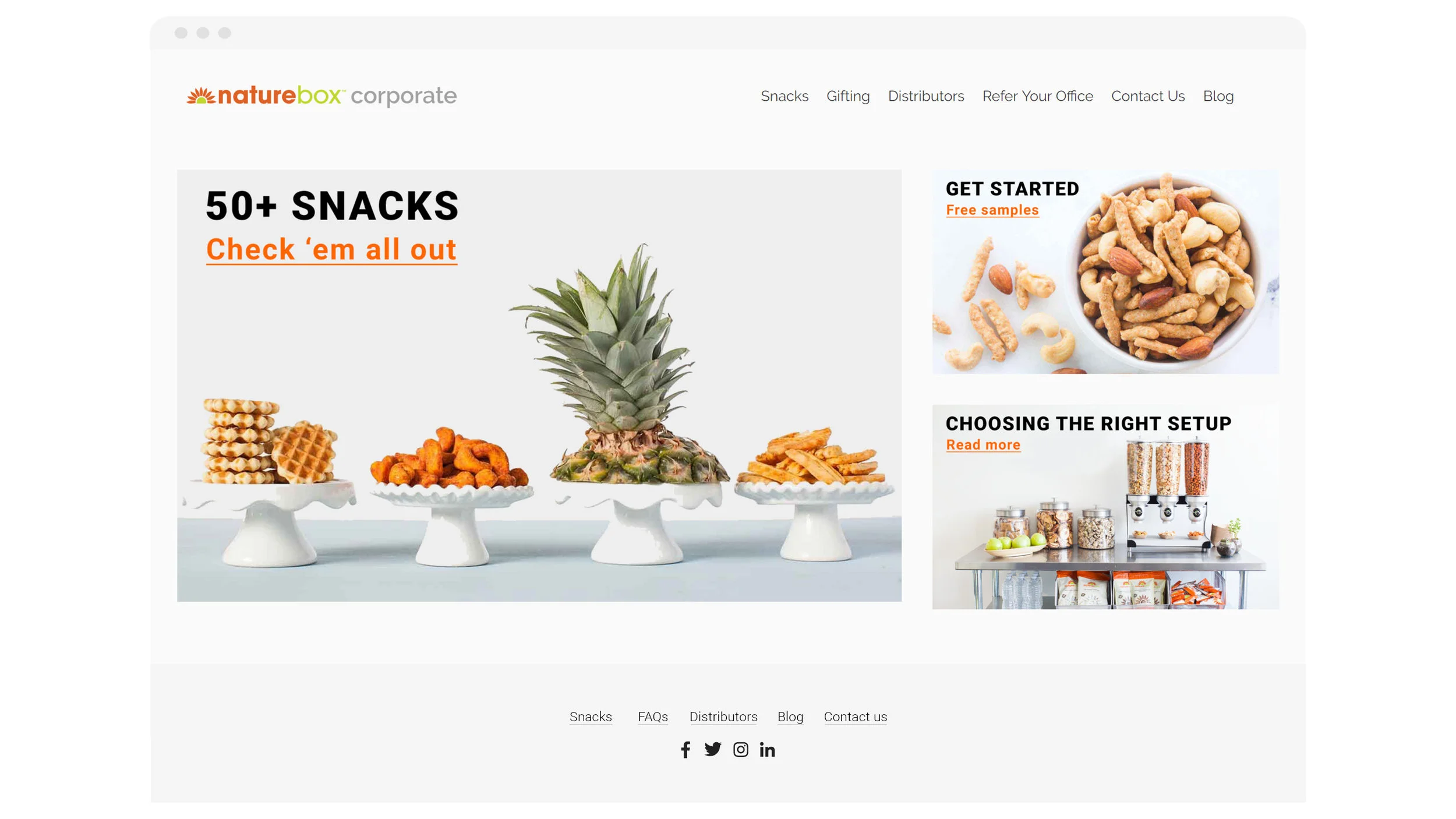 One of my major projects over the summer was revamping the corporate website to align with the NatureBox's brand. Built using Squarespace, it is primarily designed to act as a catalog for current clients to use to re-order snacks for their office.